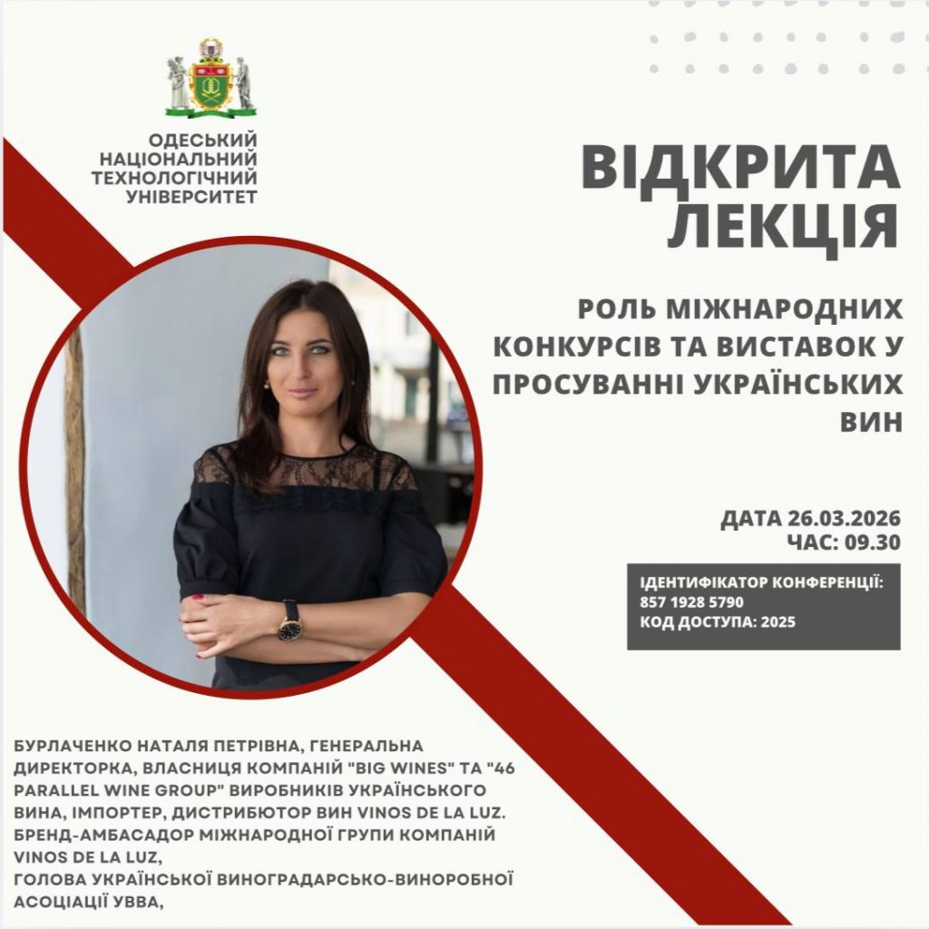 Тема відкритої лекції МІЖНАРОДНІ КОНКУРСИ ТА ВИСТАВКИ ЯК ІНСТРУМЕНТ ПРОСУВАННЯ УКРАЇНСЬКОГО ВИНА.